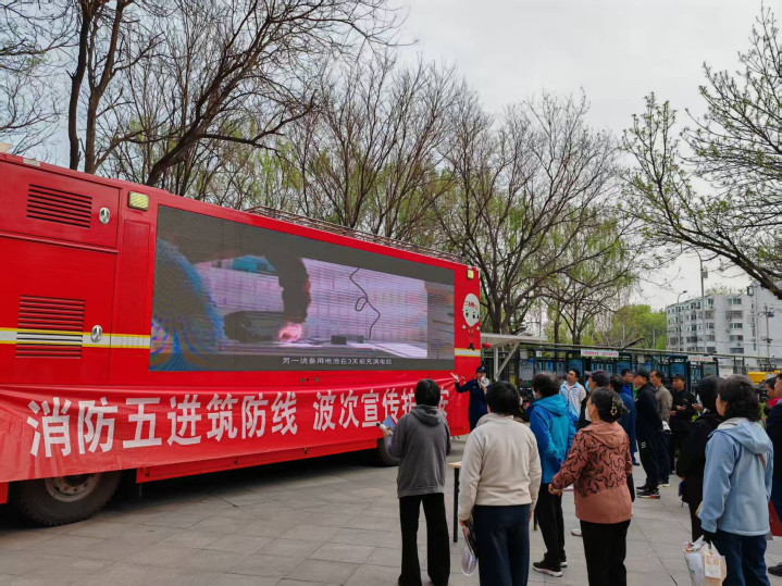 消防宣传车深入社区、校园、商圈等人员密集场所开展针对性消防安全警示教育宣讲。海淀消防供图